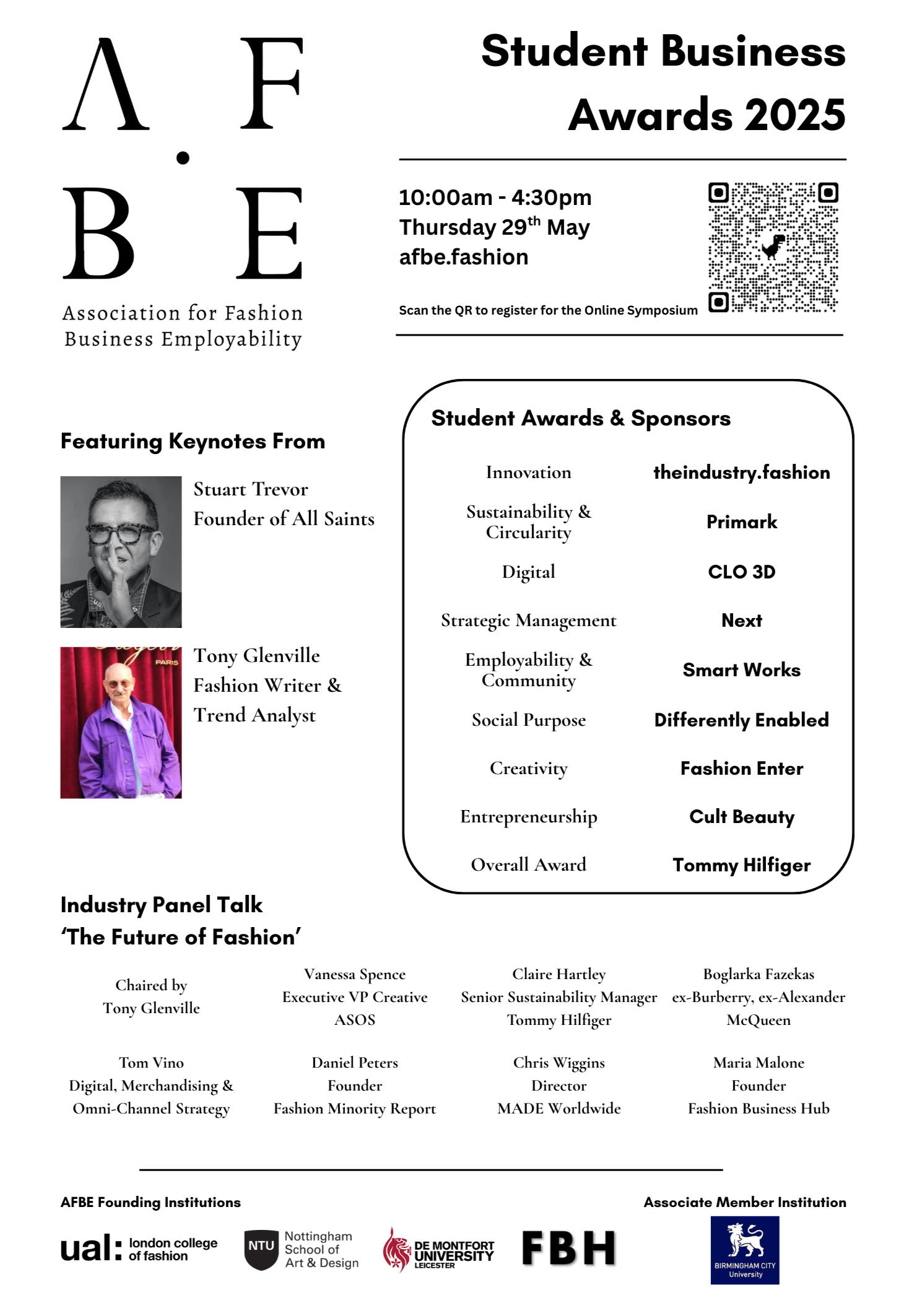 The AFBE is the fashion business sector's student awards platform, advancing employability, entrepreneurship, innovation, and inclusive leadership. Founded by two of the UK's leading fashion business schools, London College of Fashion (University of the Arts London) and Nottingham School of Art & Design (Nottingham Trent University), the AFBE celebrates and supports students achievements in fashion business education.The AFBE achieves this by providing a platform to access pathways into industry through mentorship, networking, and real-world experience. The AFBE hosts a number of events and opportunities which support students and enable connection with the fashion business industry.